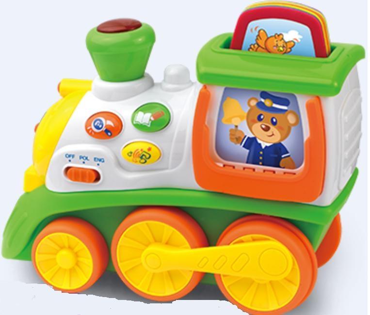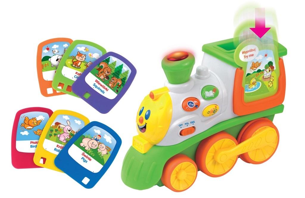 Dwujęzyczna zabawka jest świetną propozycją do nauki języka angielskiego od najmłodszych lat. Kolorowy pociąg posiada 6 dwustronnych kart z wizerunkiem 12 zwierząt. Kiedy dziecko naciśnie na przycisk ze znakiem zapytania, usłyszy polecenie żeby znalazło kartę z odpowiednim zwierzątkiem i umieściło ją w miejscu na kartę. Dodatkowo maluch usłyszy informacje o danym zwierzątku z karty np. 'Sowy polują nocą. Pociąg wydaje realistyczne dźwięki jakie wydaje lokomotywa.