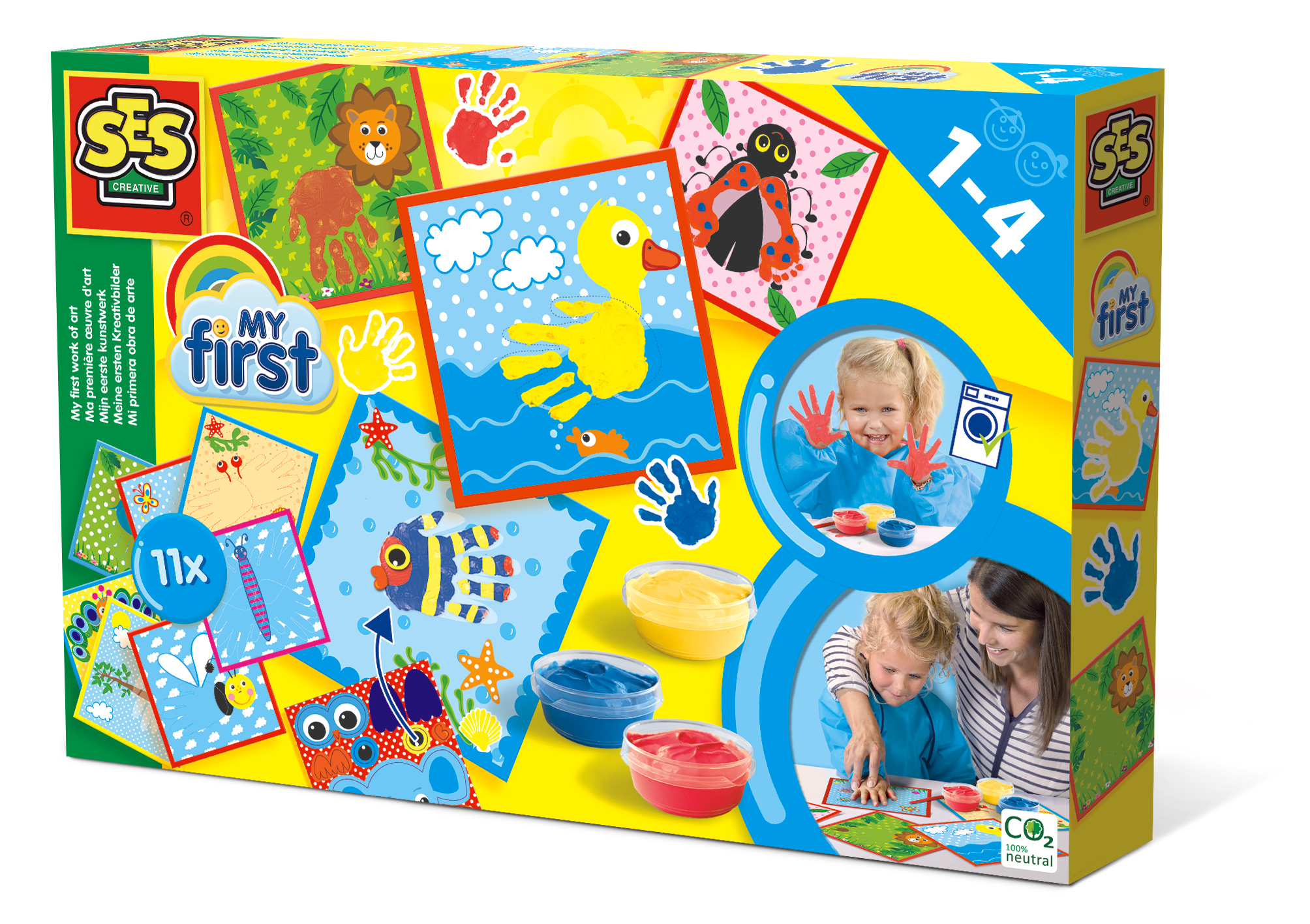 Zestaw SES mój pierwszy obraz artystyczny jest doskonałym sposobem dla rodziców, aby zapoznać dzieci z malowaniem. Dzieciom malowanie sprawia wiele radości. Zabawka zawiera wesołe szablony, na których pokazane są miejsca, gdzie powinny być umieszczone rączki albo stopy. Należy rozprowadzić na dłoniach farby i malować palcami. Na koniec możesz ozdobić swoje prace dodatkowymi kolorowymi ozdobami. Efekt jest zawsze świetny!