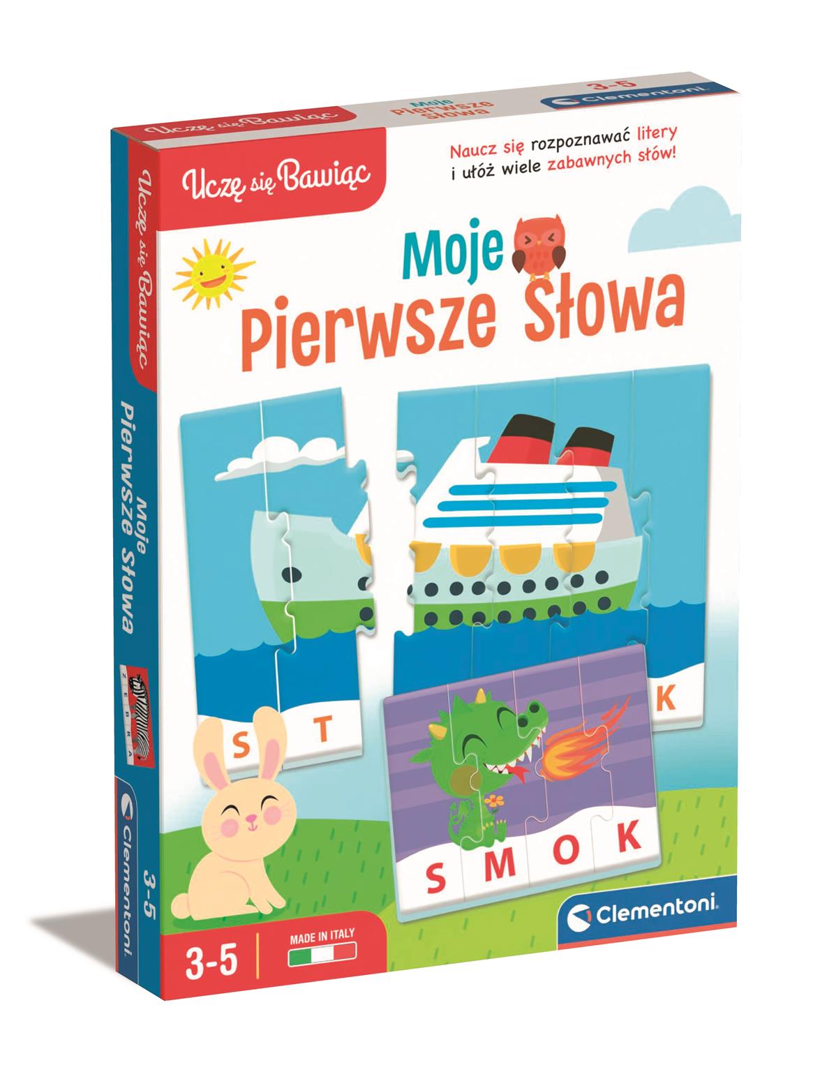 Moje Pierwsze Słowa to prosta i zabawna gra edukacyjna złożona z 16 układanek opracowanych po to, by dzieci w wieku od 4 do 5 lat nauczyły się kojarzyć litery oraz układać pierwsze słowa. Kolorowe ilustracje i zabawne postacie stymulują dziecko do układania obrazków i odkrywania wraz z każdym elementem liter składających się na dane słowo. Wycięcia puzzli umożliwiają autokontrolę i pozwalają dziecku na samodzielne sprawdzenie poprawności swoich wyborów. Dziecko może bawić się samo, a także w towarzystwie przyjaciół i rodziny dzięki wariantom gry dla grupy. To zabawa, która się nigdy nie kończy!
