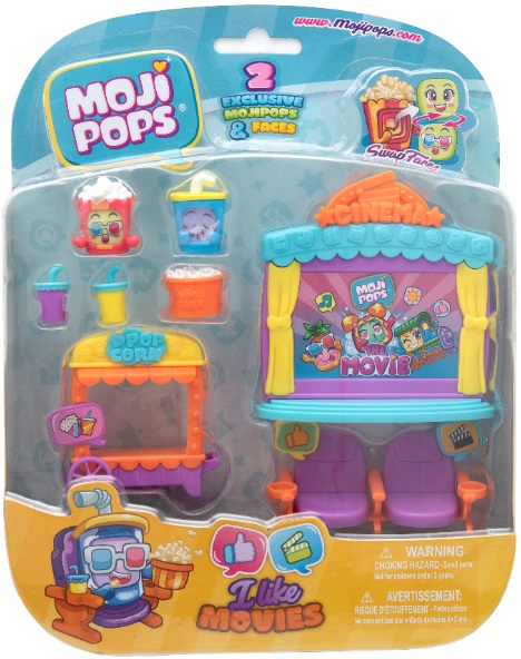 Witamy w magicznym świecie MojiPops, które tym razem idą do kina. Spędzą popołudnie zajadając się popcornem i oglądając film. Czy miło spędzą czas? Nieważne, czy będą płakać ze wzruszenia czy się śmiać ? MojiPops bez problemu wyrażają swoje emocje! W blistrze znajdują się 2 ekskluzywne figurki MoiPops z wymiennymi buziami oraz kinowe elementy do zabawy. MojiPops to wyjątkowe figurki kolekcjonerskie, które uwielbiają wyrażać swoje emocje. Buzię każdej figurki można odwrócić, by na drugiej stronie odkryć zupełnie inny wyraz twarzy. MojiPops są więc zakochane, rozbawione, smutne lub śpiące. Każda z twarzyczek odzwierciedla dwie emocje. Buzie można też wymieniać między figurkami. W kolekcji znajduje się 48 MojiPops, a każda z nich występuje w dwóch kolorach, co oznacza aż 96 postaci do zebrania i 12 różnych wyrazów twarzy. Wśród MojiPops znajduje się 6 ekskluzywnych, pokrytych brokatem postaci (Glitter).