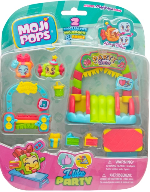 Na imprezach MojiPops dużo się dzieje! Nic dziwnego, skoro mają do dyspozycji m.in. zjeżdżalnię, prezent, tort i konsolę DJ'a. A MojiPops dobrze się bawią, wymieniają buziami i pokazując swoje minki i emocje. W blistrze znajdują się 2 ekskluzywne figurki MojiPops z wymiennymi buziami oraz elementy do zabawy. MojiPops to wyjątkowe figurki kolekcjonerskie, które uwielbiają wyrażać swoje emocje. Buzię każdej figurki można odwrócić, by na drugiej stronie odkryć zupełnie inny wyraz twarzy. MojiPops są więc zakochane, rozbawione, smutne lub śpiące. Każda z twarzyczek odzwierciedla dwie emocje. Buzie można też wymieniać między figurkami. W kolekcji znajduje się 48 MojiPops, a każda z nich występuje w dwóch kolorach, co oznacza aż 96 postaci do zebrania i 12 różnych wyrazów twarzy. Wśród MojiPops znajduje się 6 ekskluzywnych, pokrytych brokatem postaci (Glitter).
