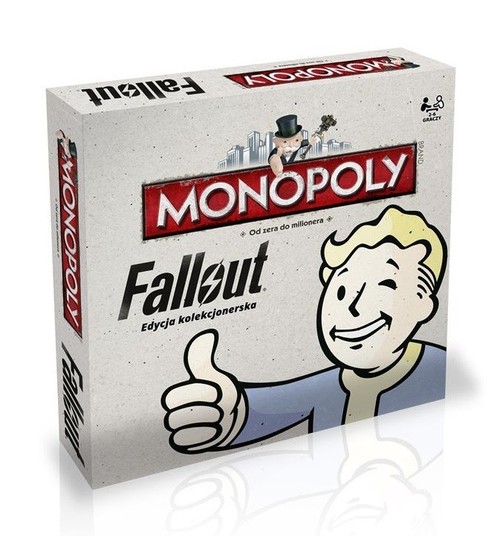 Monopoly Fallout to nie lada gratka dla fanów gry komputerowej Fallout. Odbuduj cywilizację kupując, sprzedając i handlując w postnuklearnym świecie Wspólnoty. Odwiedź miejsca znane z kultowej serii Fallout i dbaj o ich rozwój. Zbieraj kapsle i użyj ich mocy nabywczej. Doprowadź przeciwników do bankructwa i pokaż im, kto tu rządzi! Zobacz, co kryją karty „Ależ z Ciebie S.P.E.C.J.A.Ł.” i „Przewodnik Przetrwania Mieszkańca Schronu”. Dodatkowa gratka dla fanów serii to unikalne, kolekcjonerskie pionki, wśród których znajdziemy Vault Boy’a i butelkę Nuka Coli! Będzie się działo!