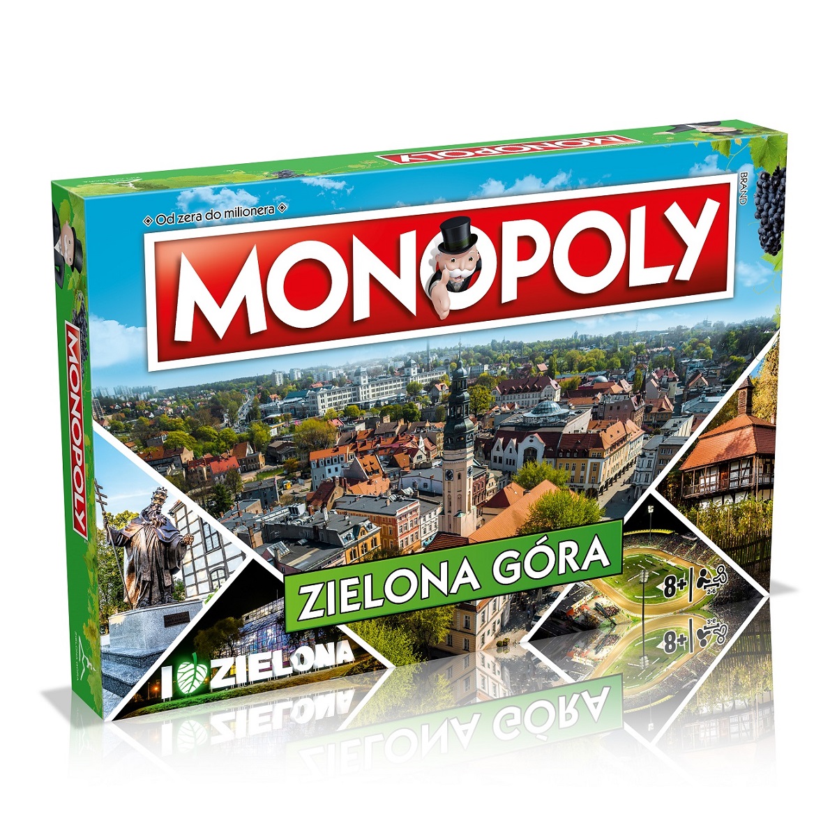 Malowniczo położone winnice, Stary Rynek z uroczymi kamieniczkami oraz lasy, lasy, lasy... To właśnie Zielona Góra – miasto znane z niezwykłych tradycji winiarskich. To tutaj odbywa się największe Święto Wina w Polsce – Winobranie. Co powiesz na przechadzkę z Bachusem po kultowym deptaku w poszukiwaniu bachusików? Chcesz otrzymać w spadku winnicę lub stać się właścicielem obiektów sportowych, w których trenują zespoły ekstraligowe? A może potrzebujesz sporej dawki humoru, którą zapewnią zaielonogórskie kabarety? Nie czekaj, rzuć kostką, wykonaj ruch, dokonaj transakcji i zbij fortunę w najnowszej - Zielona Góraskiej edycji klasycznej gry MONOPOLY! Liczba graczy: 2-6 Wiek: 8+ Czas gry: 1-3 h