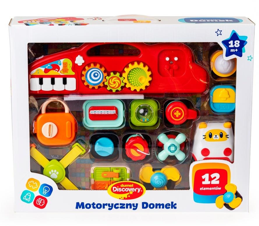 Domek stworzony z myślą o miłośnikach klocków i zręcznościowych niespodzianek! W zestawie znajdziemy dużą płytkę z wypustkami ściankę domku, do której można przypiąć klocki z motorycznymi zadaniami. Na małe paluszki czeka wiatraczek do obracania, zasuwki do przesuwania, klamerka do zapinania, element do przekręcania i wiele więcej! Dach domku wyposażony został nie tylko w praktyczny uchwyt do przenoszenia zabawki, ale także w dźwiękowy panel z mini pianinkiem i miejscem na przypięcie jednego z dwóch aktywnych klocków z dzwoneczkiem lub lampką. Dodatkowo znajdziemy tu też trybiki do przekręcania. To jeszcze nie wszystko! Poza domkiem i klockami, w skład zestawu wchodzi też pojazd z miejscami do przypięcia ulubionych, zręcznościowych klocków, żeby mogły one towarzyszyć maluchowi podczas podróży, dbając o sprawność jego paluszków.