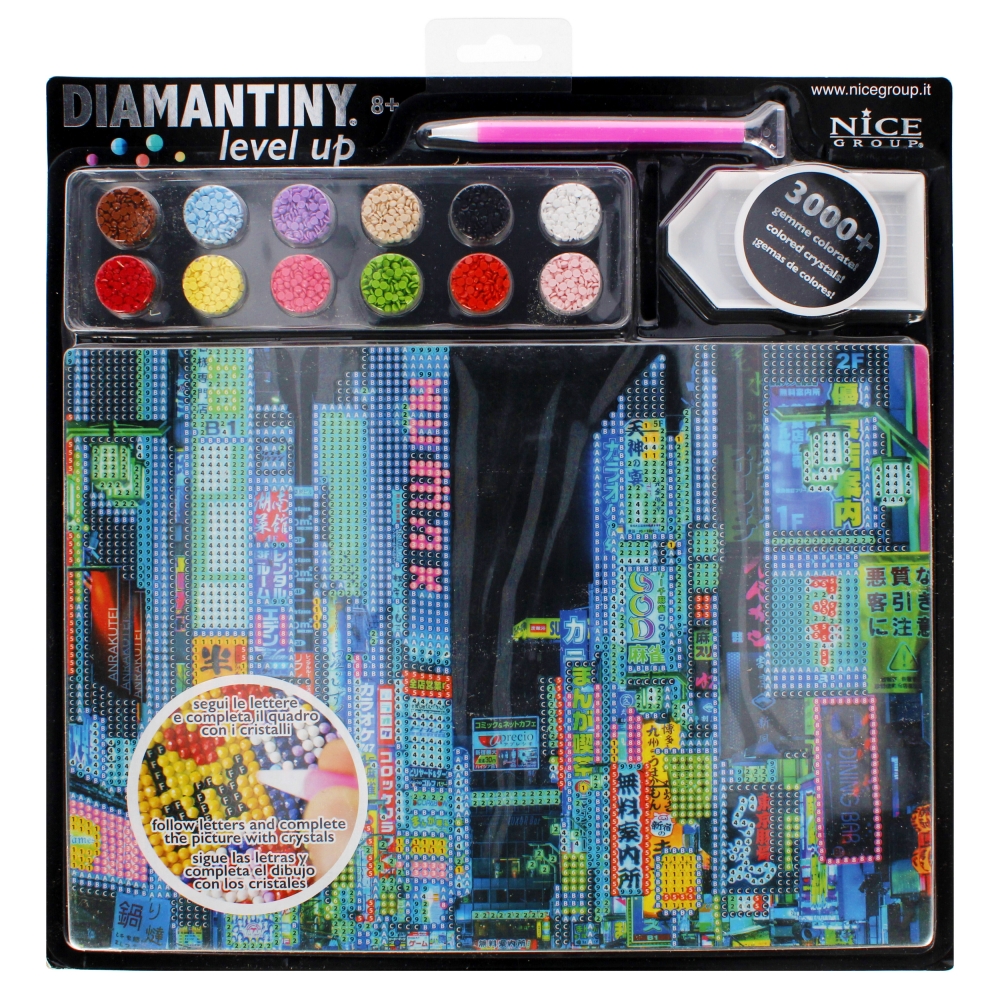 Zestaw z kryształkami do tworzenia mozaiek z kolorowymi kamieniami. Zabawa z mozaiką diamentową polega na układaniu obrazka z tysięcy malutkich, kolorowych diamencików według naniesionego na kartonie nadruku.Obrazek pokryty jest warstwą klejącą, która utrzymuje kryształki na odpowiednich miejscach. Kompletny zestaw do wykonania mozaiki zawiera: obrazek nadrukowany na grubej tekturze, na którym naniesione są literki i cyferki wskazujące miejsca, gdzie należy ułożyć poszczególne kolory; diamenciki w różnych kolorach; aplikator z woskiem, pojemnik na diamenciki oraz przewodnik po kolorach.