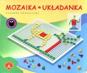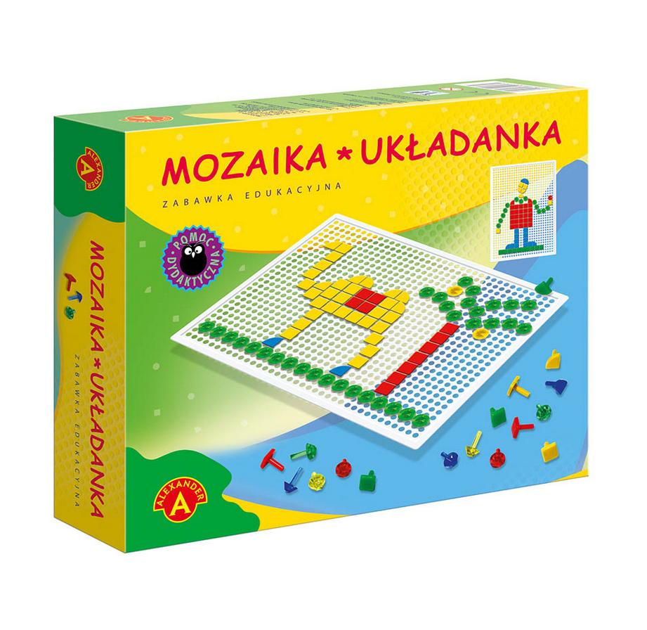 Mozaika - Układanka to zabawka edukacyjna, składająca się z ażurowej, białej tabliczki i wielu elementów zróżnicowanych kształtem i kolorem. Każdy element posiada z tyłu kołek umożliwiający wpinanie go w w otwory ażurowej tabliczki. Zabawa polega na układaniu z pojedynczych elementów wymyślonych przez siebie wzorów i obrazów. Zmusza to do dużego wysiłku wyobraźnię, jest też bardzo dobrym treningiem dla zręczności manualnej i cierpliwości. W zestawie dziecko znajdzie książeczkę z przykładowymi obrazkami do ułożenia!