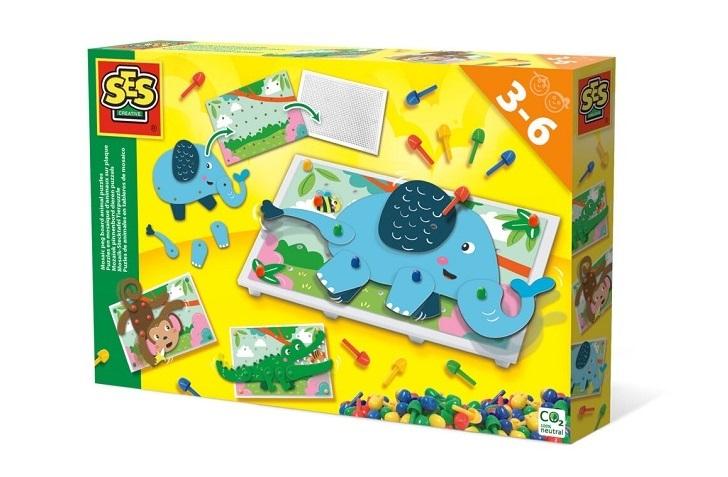 Mozaika i puzzle w jednym! Dzięki tym wesołym zwierzętom możesz przypinać różne części do obrazka dżungli za pomocą jednej ze 100 kolorowych pinezek. Stwórz słonia, małpę lub krokodyla i spraw, aby zwierzęta poruszały się, gdy skończysz!