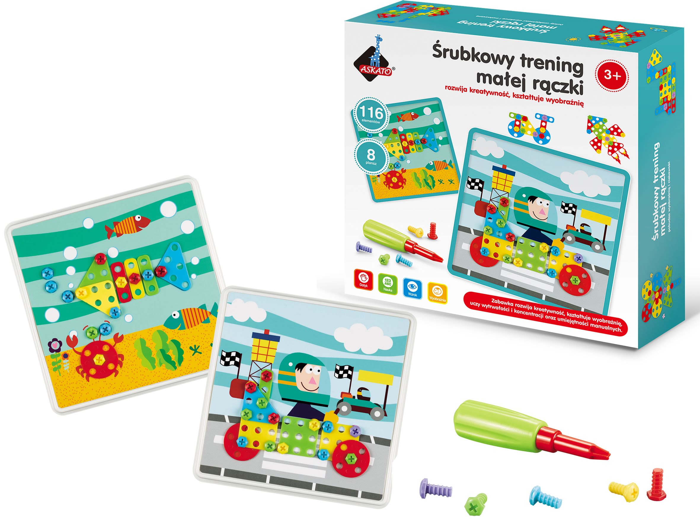 Przykręcanie kolorowych śrubek wymaga precyzji ruchów ręki - zabawka usprawni motorykę małą, pozwoli opanować chwyt pisarski oraz rozwinie umiejętności grafomotoryczne.