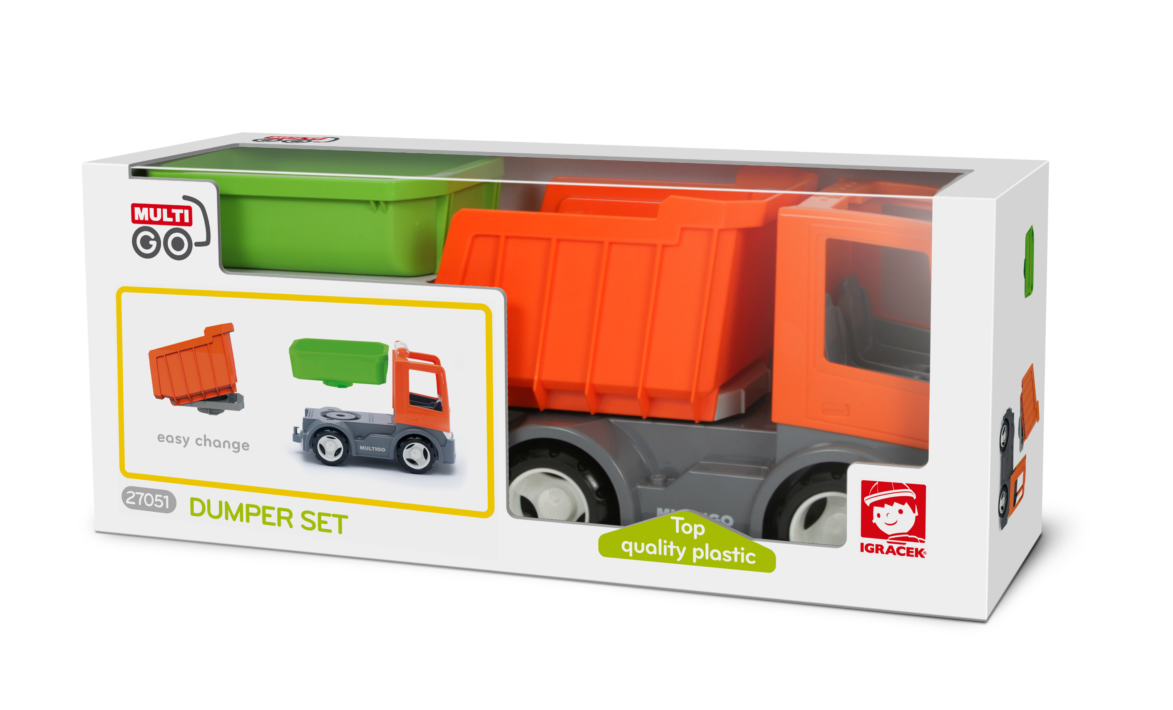 MultiGO to linia samochodów ciężarowych z poręcznym systemem bayonet, który umożliwia małym dzieciom wymianę rozszerzeń i innych akcesoriów.