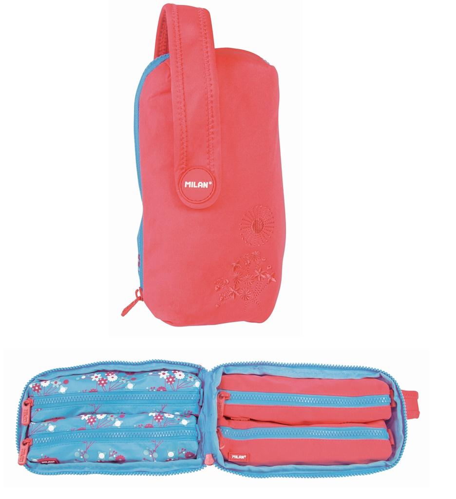 Zestawy kreatywne „MILAN KITS” stworzone specjalnie dla dzieci i z myślą o nich. To seria produktów do rysowania i malowania, które rozwijają kreatywność. Łączą w sobie naukę z zabawą. Idealne do przedszkola, szkoły, ale także w domu, podróży czy na wakacjach. W środku 4 piórniki z wyposażeniem przyczepiane na rzepy, które można używać osobno lub jako całość. Wyposażenie: 12 flamastrów ze stożkową końcówką, 12 kredek trójkątnych, 3 długopisy, ołówek HB, temperówka BASIC, 1 gumka syntetyczne MILAN, linijka. Kolekcja BLOSSOM model: 08872BLSE Materiał wierzchni: poliester, podszewka: poliester.
