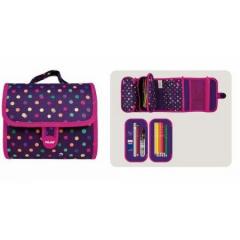 Zestawy kreatywne „MILAN KITS” stworzone specjalnie dla dzieci i z myślą o nich. To seria produktów do rysowania i malowania, które rozwijają kreatywność. Łączą w sobie naukę z zabawą. Idealne do przedszkola, szkoły, ale także w domu, podróży czy na wakacjach. W środku 2 piórniki z wyposażeniem przyczepiane na rzepy, które można używać osobno lub jako całość. Wyposażenie: 12 kredek trójkątnych, 3 długopisy, ołówek HB, temperówka BASIC, gumka syntetyczna MILAN, linijka. Kolekcja N-DOTS 2 model: 08829DT Materiał wierzchni: poliester, podszewka: poliester.