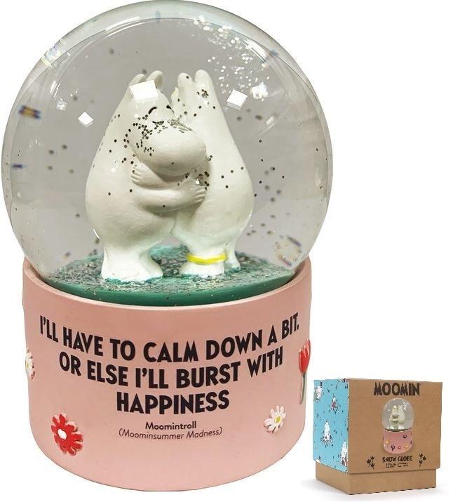 Muminki Śnieżna kula 65mm - Miłość (Moomin - Hug) to pełna uroku kula śnieżna, która przenosi nas w magiczny klimat Doliny Muminków. W jej wnętrzu Muminek i Migotka przytulają się wśród wirujących płatków śniegu, otoczeni kwiatowym motywem na delikatnie różowej podstawie. Uroku dodaje cytat: "I'll have to calm down a bit. Or else I'll burst with happiness", który podkreśla emocjonalny wydźwięk sceny. Produkt zapakowany jest w ozdobne pudełko, co czyni go idealnym prezentem.