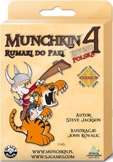 Dodatek zawiera 110 nowych kart do kultowej gry MUNCHKIN, w której zabijasz potwory, zgarniasz skarby i oszukujesz kumpli, bez tego całego durnego odgrywania postaci.Masz już dosyć przemierzania lochów pieszo? Od teraz munchkinowe stajnie są pełne Rumaków , m.in. Potężnych Rumaków Bojowy, Ziejących Ogniem Smoków , Gdaczących Kur oraz Orłów, na których wzniesiesz się ku przestworzom...lochów! Każdy z Rumaków ma wypasione moce!Dodatkowo znajdziesz tu całą masę Przydupasów, którzy bez zmrużenia oka oddadzą za Ciebie życie, abyś mógł spokojnie Uciec. Albo poniosą Twój dobytek i podsuną broń we właściwym momencie, więc używaj ich bonusów i zdolności, plądruj lochy i zostań super Munchkinem! Dodatek Munchkin 4 zawiera unikatowe karty, stworzone specjalnie na potrzeby polskiej edycji!