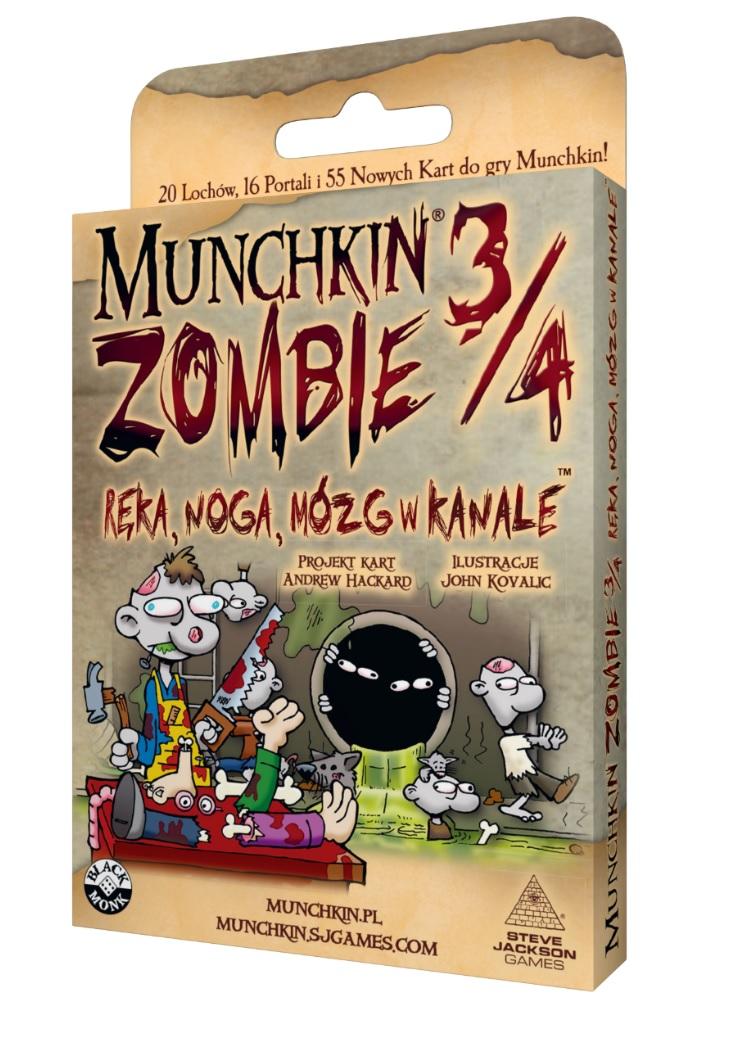 ....jeszcze więcej Potworów do pokonania, jeszcze więcej Lochów do zwiedzenia! Munchkin Zombie 3/4 - Ręka, Noga, Mózg w Kanale to 55 nowych kart Drzwi i Skarbów, 20 kart Lochów oraz 16 Portali! Wykorzystaj nową Moc, Solo, i pokaż innym zombiakom z dzielni, kto tu rządzi. Złap Części Zamienne, załóż Rękawice do Kręgli i dopadnij Twojego Byłego Współlokatora. A to wszystko w Biurowcu Żywych Trupów lub Barze Szybkiej Śmierci! Łapiesz klimat?