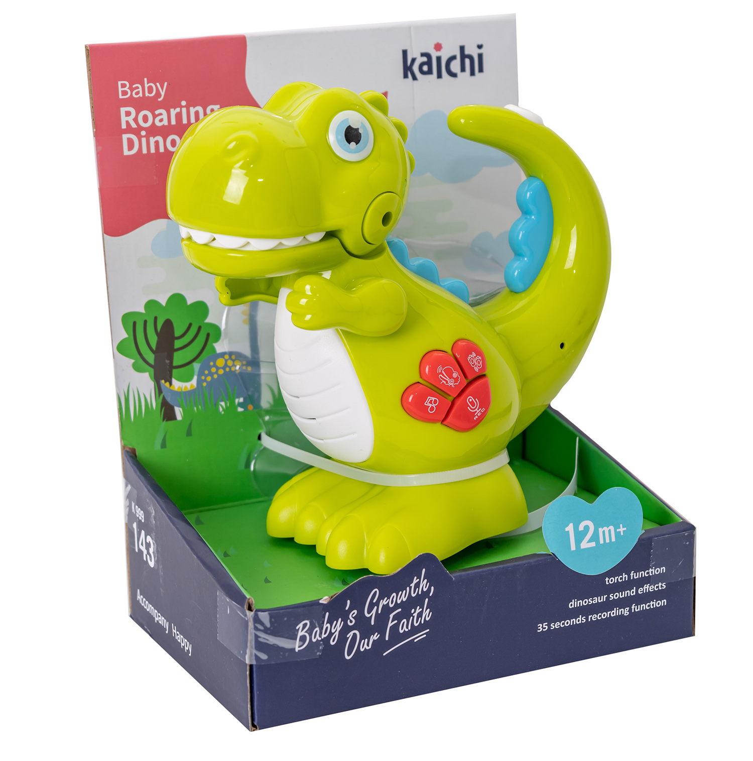 Zabawkowy dinozaur świecący i wydający dźwieki. Zabawka zasilana 2 bateriami AA, dołączonymi do zabawki.