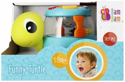 Muzyczny Żółwik aktywizuje rozwój maluszka od ok. 18 m-ca na wielu płaszczyznach. Kolorowe przyciski na pancerzu wygrywają różnorodne dźwięki, w tym melodie, dźwięki instrumentów muzycznych czy kojący szum fal, ucząc ich rozpoznawania oraz rozwijając zmysł słuchu. Przy potrząsaniu żółwika bajecznie kolorowe, małe żółwiki grzechoczą w środku pancerza, dostarczając jednocześnie doznań wizualnych, wspierających rozwój zmysłu wzroku. Chwytanie, manewrowanie żółwikiem, przyciskanie kolorowych guziczków angażuje uwagę dziecka, uczy skupienia i koncentracji, a jednocześnie usprawnia zdolności manualne i motorykę małą. Wymiary/waga/baterie: wymiary produktu (dł. x wys. x gł.)[cm]:15x8x12, wymiary opakowania (dł. x wys. x gł.)[cm]: 16x10x13, waga produktu bez opakowania [kg]: 0,13 kg, waga produktu w opakowaniu [kg]: 0,20 kg, wymaga zasilania bateriami 2 x AAALR03- załączono do zestawu. Zabawka pakowana w kartonik z otwartym okienkiem.