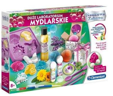 Zawartość zestawu: baza zapachowa kwiatowa, baza o słodkim zapachu, baza łagodząca, baza detergentowa, baza mydlana, czerwony barwnik, 3 pipety, kubeczek z podziałką, szpatułka, łopatka, mieszadełko, buteleczka na płyn do kąpieli, forma do mydełek, forma do kul kąpielowych, naklejki, pudełeczka do złożenia, instrukcja