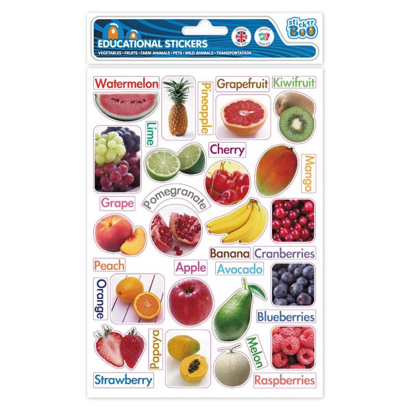 Naklejki edukacyjne owoce. Duże kolorowe naklejki pomagają w poznawaniu i zapamietaniu najważniejszych słówek. Idealne do nauki języka angielskiego.