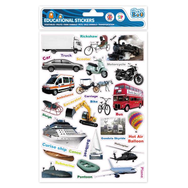 Naklejki edukacyjne pojazdy. Duże kolorowe naklejki pomagają w poznawaniu i zapamietaniu najważniejszych słówek. Idealne do nauki języka angielskiego.