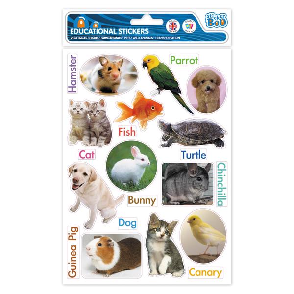 Naklejki edukacyjne zwierzęta domowe. Duże kolorowe naklejki pomagają w poznawaniu i zapamietaniu najważniejszych słówek. Idealne do nauki języka angielskiego.