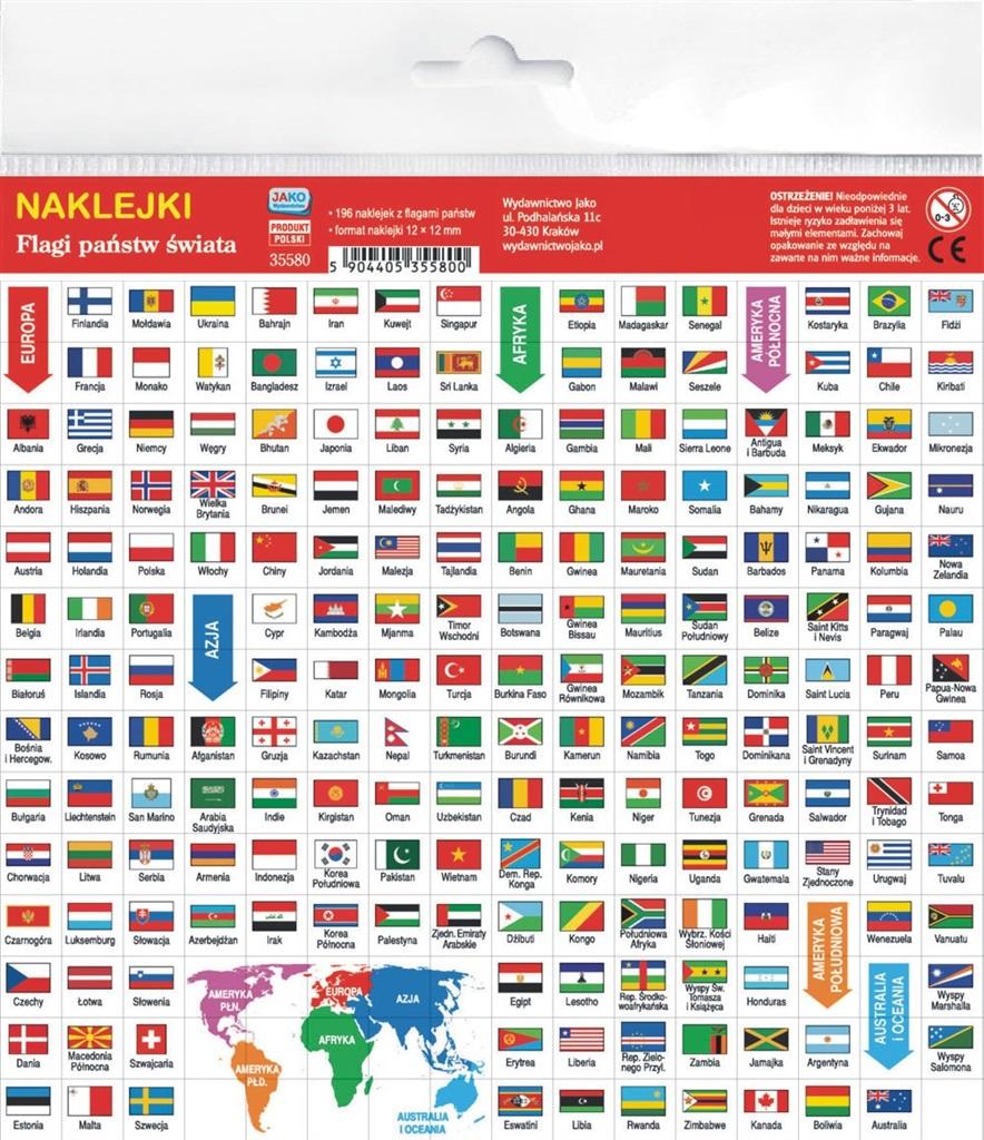 Zestaw samoprzylepnych naklejek z flagami idealnie nadaje się do wszelkich prac kreatywnych. Naklejki mogą być używane do ozdabiania kartek okolicznościowych, prezentów, notesów, zeszytów oraz pudełek. Doskonale sprawdzą się także jako nagrody motywacyjne.Każda naklejka zawiera flagę oraz nazwę kraju. Format pojedynczej naklejki: 12 x 12 mm.