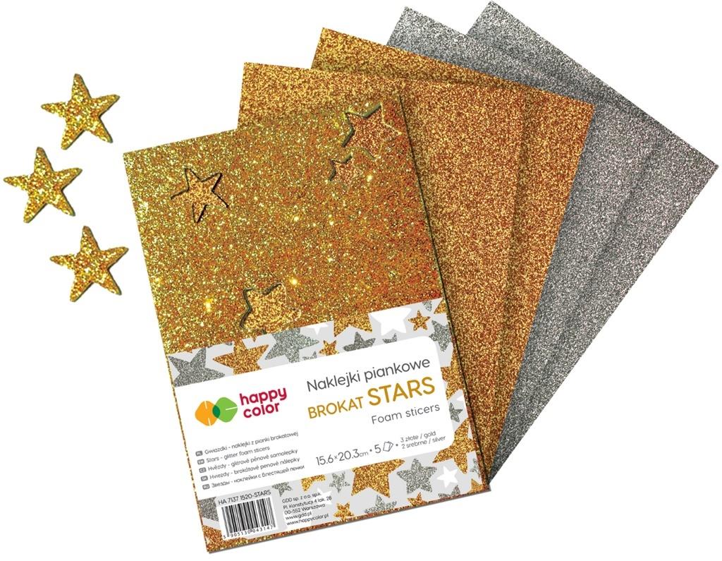 - Zestaw arkuszy samoprzylepnych złotych i srebrnych z naciętymi gwiazdkami różnej wielkości - Wystarczy wypchnąć pojedyncze gwiazdki i nakleić na tworzone kartki i dekoracje świąteczne - Format A5 - Grubość 2 mm - 5 ark.: 2 srebrne i 3 złote