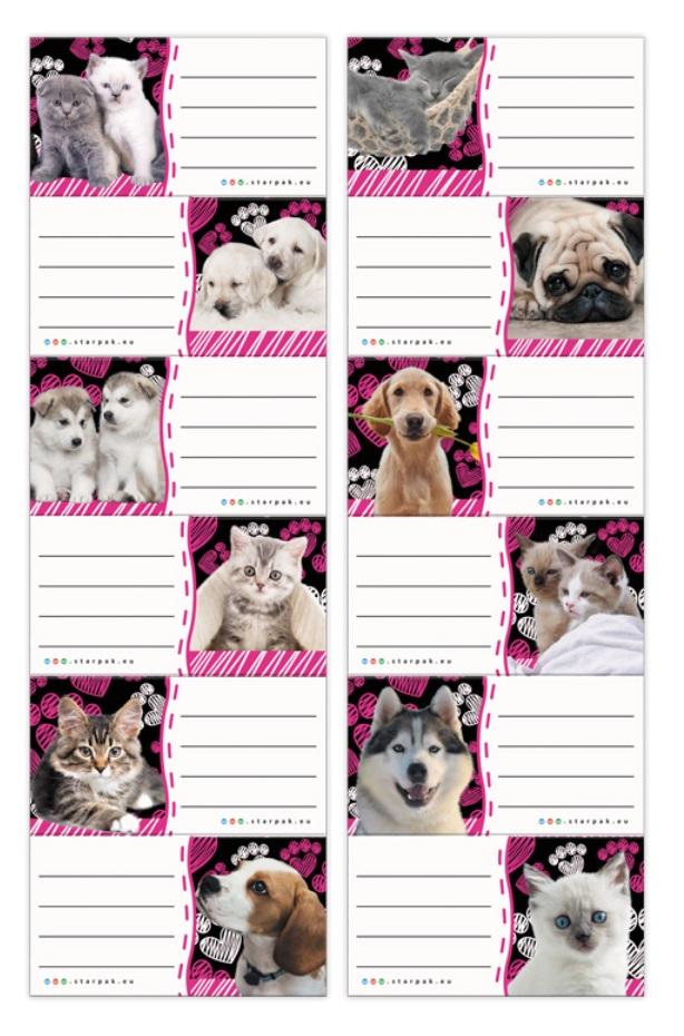 Zestaw kolorowych naklejek na zeszyty z wizerunkami Kotów i Psów z kolekcji Starpak. Naklejki dostępne w kilku wzorach. Na listku znajduje się 6 sztuk. Naklejki pozwalają na opisanie zeszytów szkolnych, dzięki czemu unikniemy pomyłek przy pakowaniu tornistra do szkoły.