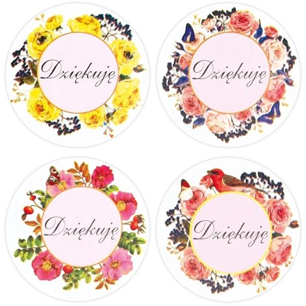 Naklejki papierowe na taśmie 8 wzorów kwiatowych z napisem Dziękuję O25mm 500szt.