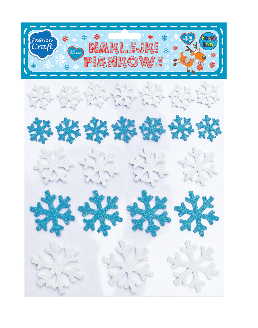 Zestaw zawiera 25 samoprzylepnych, piankowych naklejek w kształcie śnieżynek. Naklejki mają różną wielkość i dostępne są w 2 kolorach: białym, niebieskim.