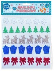 Zestaw zawiera 32 samoprzylepne, piankowe naklejki. Dostępnych jest 5 wzorów: śnieżynki, choinki, renifery, prezenty i kokardy.