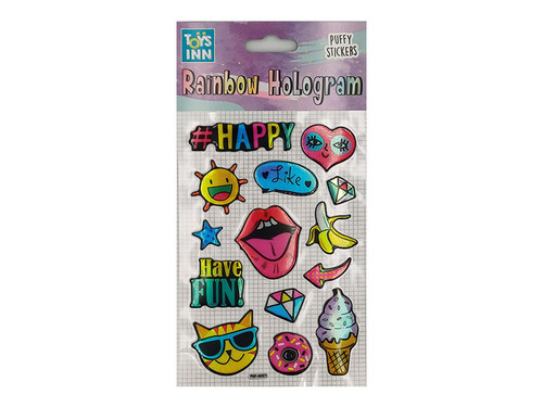 Naklejki holograficzne Happy, to idealna dekoracja pamiętników, albumów, zeszytów czy telefonów. W zestawie znajduje się około 10 szt kolorowych naklejek o różnych kształtach. Holograficzna powłoka z efektem tęczy zmienia ich kolory w zależności od kąta padania światła, dzięki temu naklejki są oryginalną, przyciągającą wzrok ozdobą. Naklejki wykonane zostały z wysokiej jakości materiałów, które są trwałe i odporne na zniszczenia