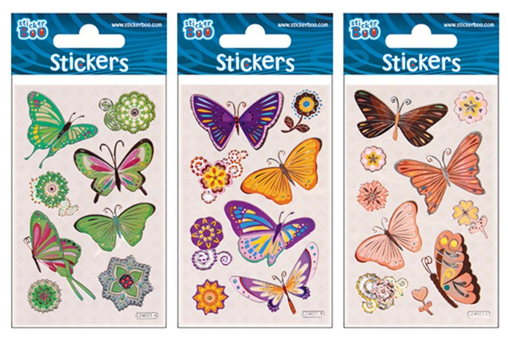Naklejki STICKER BOO z grafiką z Motylami z pewnością przypadną do gustu dzieciakom, idealne do zdobienia rysunków, wszelkiego rodzaju prac plastycznych oraz kolekcjonowania, naklejki ze srebrną obwódką. Dostępne w 3 odsłonach graficznych.
