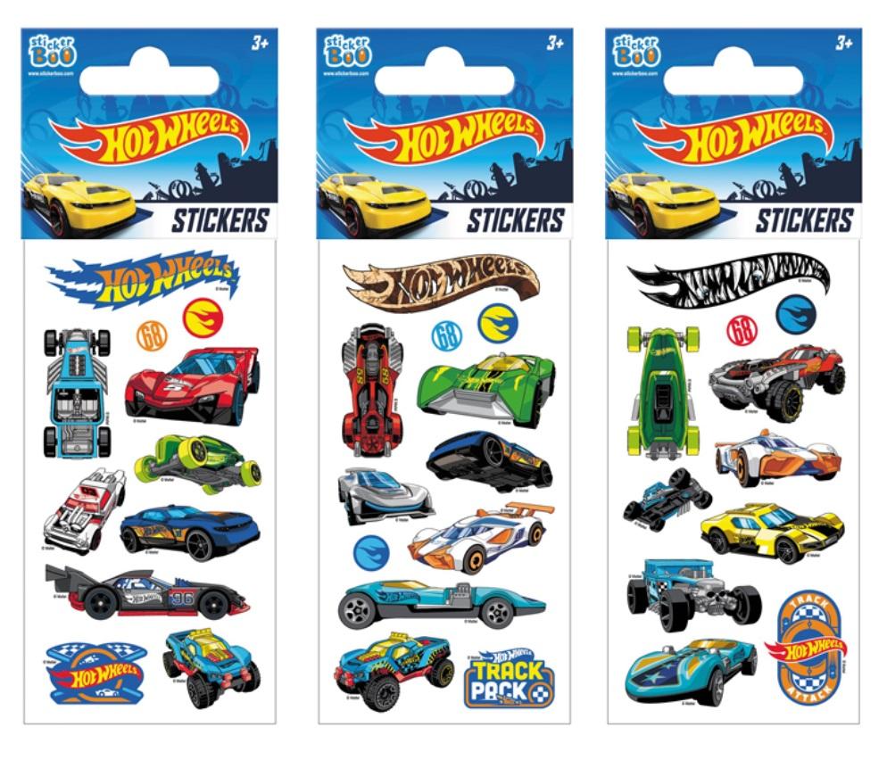 Naklejki z samochodami Hot Wheels, ozdobione srebrną obwódką.