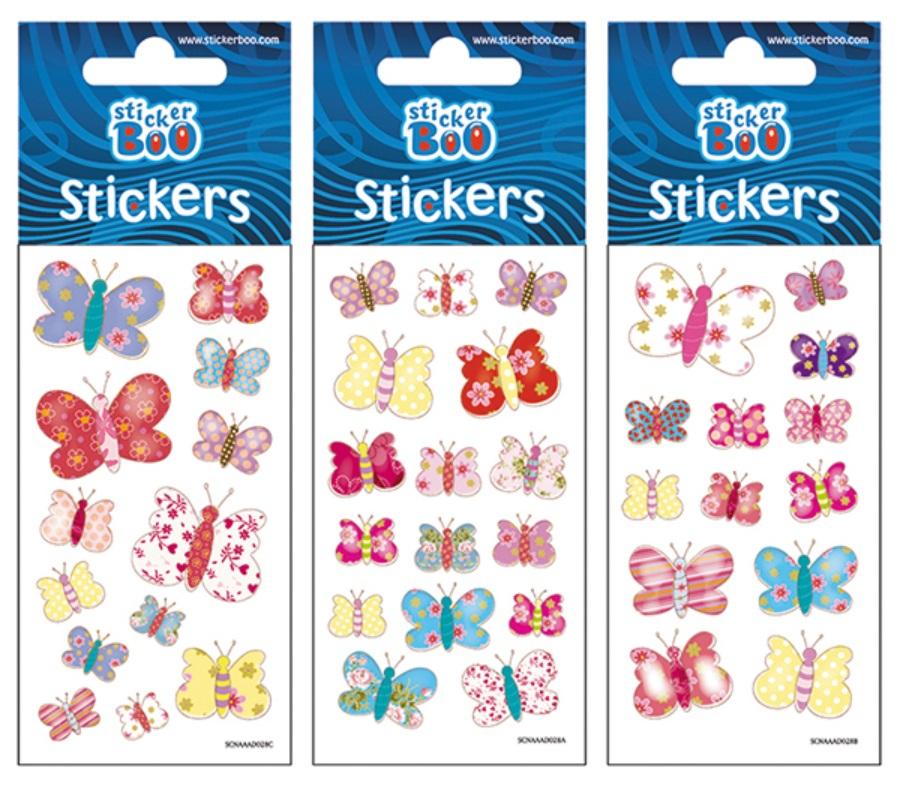Naklejki STICKER BOO z grafiką z Motylami z pewnością przypadną do gustu dzieciakom, idealne do zdobienia rysunków, wszelkiego rodzaju prac plastycznych oraz kolekcjonowania, naklejki ze złotą obwódką. Dostępne w 3 odsłonach graficznych.