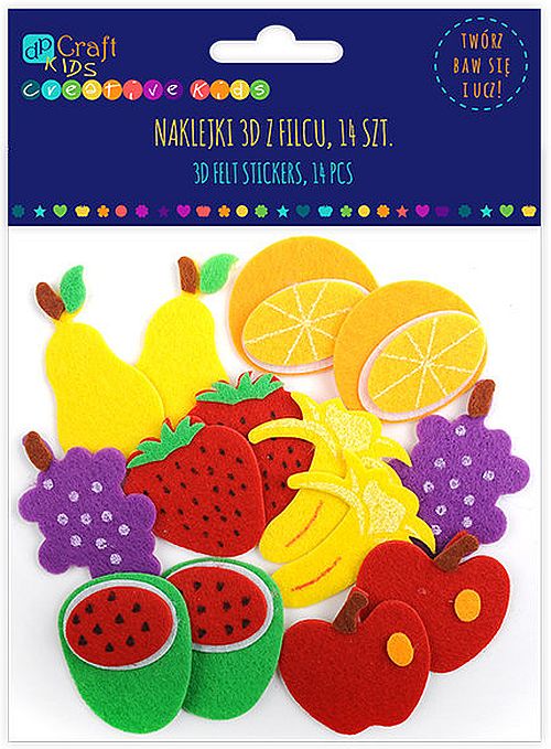 Zestaw warstwowych naklejek z filcu, z motywami owoców.