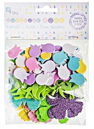 Zestaw naklejek z pianki w kształcie króliczków i pisanek w kilku kolorach oraz brokatowych naklejek w kształcie marchewek.