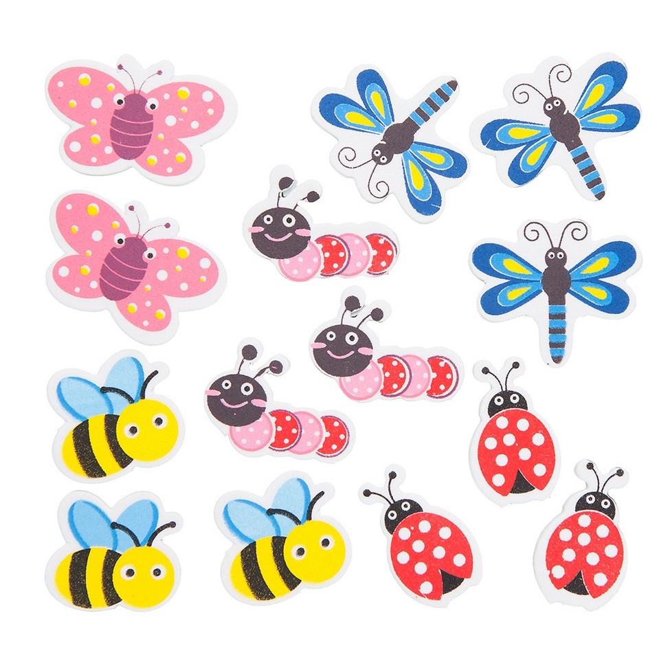 Zestaw naklejek z pianki z kolorowym nadrukiem, z motywami owadów, w kilku różnych wzorach.