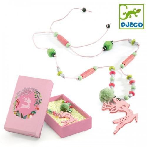 Przepiękny, drewniany naszyjnik z kolorowymi koralikami i różowym jelonkim z pomponikiem. Naszyjnik zapakowany w małe eleganckie pudełeczko będzie wspaniałym prezentem.