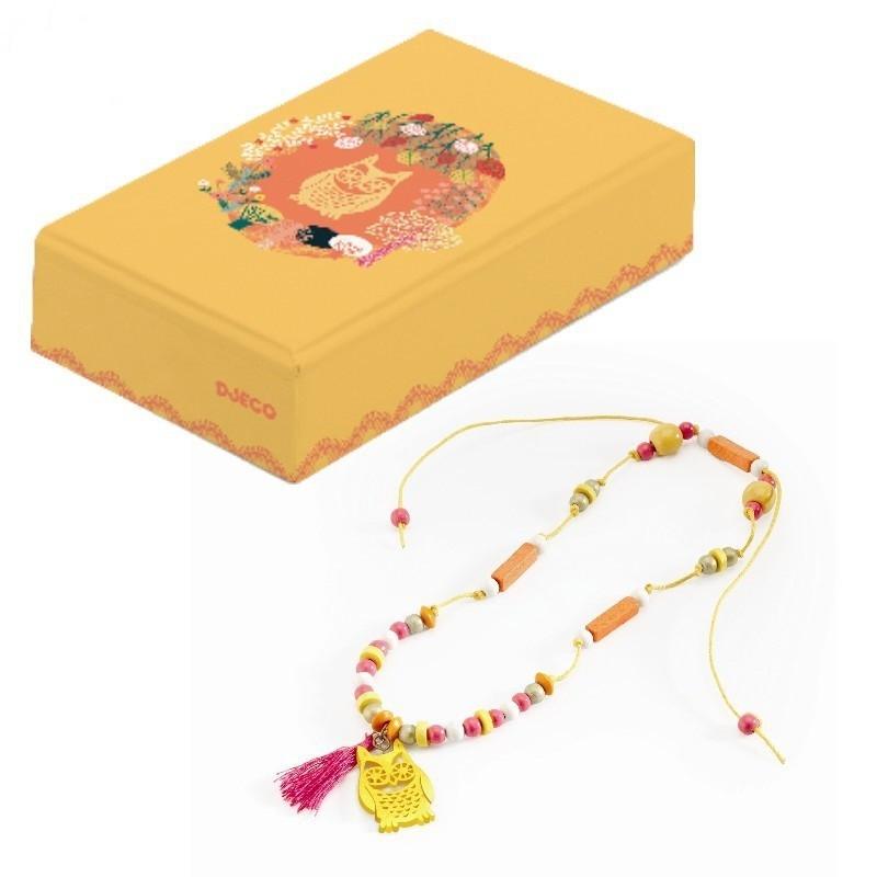 Przepiękny, drewniany naszyjnik z kolorowymi koralikami i żółtą sową z chwaścikiem. Naszyjnik zapakowany w małe eleganckie pudełeczko będzie wspaniałym prezentem.