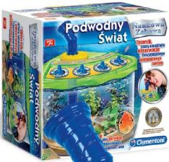 Akwarium słodkowodne z peryskopem (wyposażonym w szkło powiększające) do obserwacji podwodnego życia. Boczny system wymiany wody, 1 duży zbiornik, zawiera kamyczki, zawiera urozmaicone sztuczne dno, nie zawiera ryb.