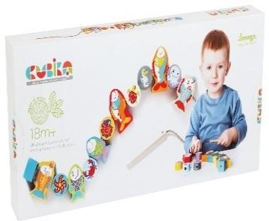 Zestaw składa się z 12 rybek i innych zwierzątek morskich, sznurka z ogranicznikiem na końcu i długą drewnianą igłą, 8 kart z zadaniami.
