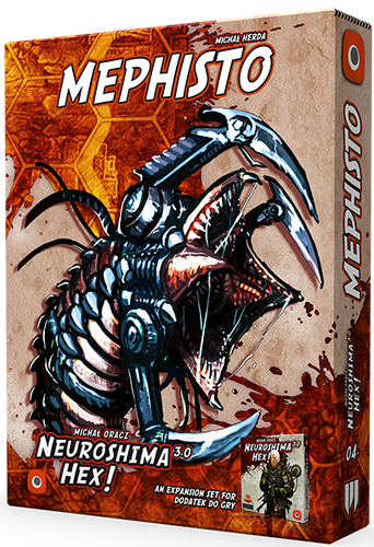 Anomalie rodem z radioaktywnych lejów po bombie rodzą potworności, o których nie śniło się przedwojennym naukowcom. Mephisto to gigantyczny czerw, jedyna w swoim rodzaju synteza ciała i stali, która stanowi zagrożenie nawet dla dobrze uzbrojonych sił ekspedycyjnych. Skażony krater kusi jako szlak na skróty i źródło zasobów, lecz nader często staje się dla przybyszów cmentarzyskiem. Wejście na terytorium monstrum oznacza bowiem zmagania na jego zasadach, z mrowiem pułapek i podstępów z dawna czekających na ofiarę. To jak walka z całą armią, a nie z pojedynczą istotą! Mephisto, zaprojektowany przez Michała Herdę jest już czwartym armypackiem. Jeśli zastanawiacie się jak może wyglądać armia zaprojektowana przez człowieka który stworzył Hexogłówki, to Mephisto jest dla was odpowiedzią. W przypadku Mephisto cały ciężar ofensywy tej armii dźwiga na sobie jej sztab. Podobnie jak w przypadku armii Dancer, ma on możliwość atakowania sztabów przeciwnika, jednak w całej armii nie znajdziemy żadnej jednostki która mogła by go w tym wyręczyć. Dodatkową siłę i skuteczność ataku sztabu zapewniają w armii Mephisto Wszczepy. Wszczepy są nowym rodzajem jednostki pozwalającym zapewnić Mephisto dodatkową siłę, inicjatywę, a czasem i dodatkowe akcje możliwe do wykonania na planszy. Wszczep Transmitera pozwala na wykonanie akcji Roszada, wszczep Ogona pozwoli odepchnąć jednostki przeciwnika. Dzięki Wszczepowi Szczęk będziemy mogli nawet wywołać bitwę nie mając żetonu bitwy na ręce. Jak silne może być Mephisto? Wyłożenie wszystkich wszczepów Szponów na planszę pozwoli Mephisto atakować z potworną siłą 5, a to wciąż nie jest kres jego możliwości. Tak ogromna siła połączona z umieszczonymi na planszy, praktycznie pozbawionymi możliwości obrony Wszczepami, stwarza na zupełnie nowe sytuacje i wymusza na graczu nowe podejście do strategii. Przed wami Mephisto. Ucierane na przestrzeni lat schematy zostaną złamane. Do gry wymagana jest wersja podstawowa gry Neuroshima Hex