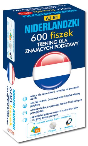 Niderlandzki 600 fiszek Trening dla znających podstawy to wyjątkowy kurs przeznaczony dla osób, które opanowały podstawy języka. Tworzą go: ponad 600 ponumerowanych fiszek, płyta z nagraniami i programem multimedialnym oraz praktyczne pudełko z kolorowymi przegródkami. Nauka z fiszkami pozwala szybko i skutecznie opanować 600 najczęściej używanych w języku niderlandzkim słów i wyrażeń. Przykłady użycia słów w 600 zdaniach to gotowe wzorce komunikacyjne. Aby ułatwić zapamiętanie materiału metodą skojarzeń, kurs podzielono na 20 grup tematycznych, a kolorowe przegródki pomagają usystematyzować opanowany materiał.Do kursu dołączono program Aktywny Trening z ćwiczeniami, który umożliwia tworzenie indywidualnych list nagrań, odsłuchiwanie ich na dowolnym odtwarzaczu i głośne powtarzanie za lektorem. Dodatkowo dzięki funkcji karaoke można sprawdzić na ekranie wyświetlacza prawidłową pisownię słówek, a rozwiązując testy, aktywnie sprawdzić stopień opanowania materiału z fiszek i skutecznie utrwalić znajomość słownictwa. Nauka z kursem pozwala szybko i skutecznie opanować praktyczne zwroty oraz poszerzyć zasób słownictwa na poziomie podstawowym i średnio zaawansowanym.Kurs językowy z fiszkami to nie tylko skuteczna metoda aktywnego przyswajania słownictwa, ale również wygodny i atrakcyjny sposób na naukę w dowolnej chwili i czasie: w drodze do pracy, szkoły, w podroży czy na spacerze.Dzięki nauce z fiszkami:- opanujesz 600 wyrażeń i zwrotów z 20 grup tematycznych,- dzięki przykładowym zdaniom poznasz podstawy gramatyki języka niderlandzkiego,- utrwalisz słówka i poznasz ich użycie w kontekście,- z programem Aktywny Trening stworzysz własną playlistę i odsłuchasz ją na dowolnym odtwarzaczu,- z nagraniami MP3 opanujesz właściwą wymowę- będziesz ćwiczył język w każdym miejscu i o każdej porze.