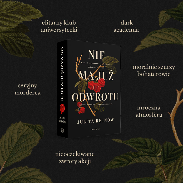 Julita Rejnów – debiutująca autorka, która od zawsze kocha książki. Już w dzieciństwie chłonęła opowieści, a z czasem zaczęła tworzyć własne – pełne tajemnic, napięcia i mroku. Fascynuje ją to, co zagadkowe: kryminały, thrillery, fantasy. Z zamiłowania pasjonatka języków obcych, z wykształcenia filolożka angielska. Lubi jogę, taniec i długie spacery z psem o imieniu Migdał. W pisaniu stawia na emocje i atmosferę – jej historie wciągają i zostają z czytelnikiem na długo.