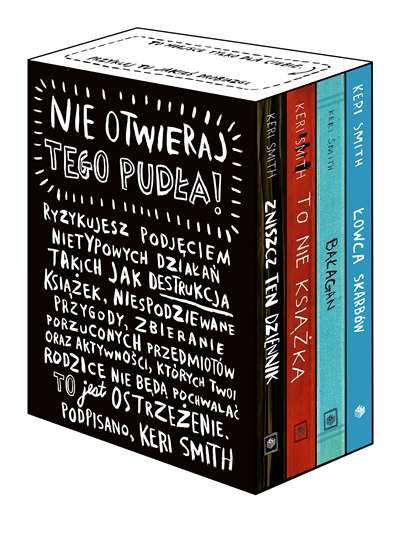 "NIE OTWIERAJ TEGO PUDŁA!" to nowy pakiet 4 bestsellerowych książek Keri Smith - "Zniszcz ten dziennik", "To nie książka", "Bałagan" oraz “Łowca Skarbów” w wersji DELUXE zaprojektowany przez samą Keri Smith. To limitowana edycja w wyjątkowym opakowaniu.