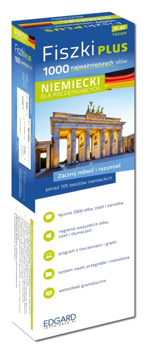 Zawartość: 1000 fiszek + CD-ROM z programem i nagraniami MP3 + Kolorowe przegródki + etuiDlaczego Fiszki Plus?- uczysz się, korzystając z kompleksowego systemu o doskonałej jakości merytorycznej- ćwiczysz wymowę i trenujesz rozumienie ze słuchu tworzysz playlisty nagrań, które odpowiadają Twoim potrzebom - do wykorzystania na komputerze, w telefonie lub odtwarzaczu mp3- powtarzasz aktywnie z programem poprzez ?wiczenia i gry językowe- poznajesz gotowe wzorce komunikacyjne w przykładowych zdaniachCzy wiesz, ze 1000 słów wystarczy, by czytać ze zrozumieniem 70% tekstów użytkowych w języku obcym? Fiszki Plus to kompleksowy system nauki - poznasz z nim ponad 1000 najważniejszych słów, a także wzory odmian, formy nieregularne oraz poprawna wymowę. Przykładowe zdania do KAŻDEGO słówka to gotowe wzorce komunikacyjne, dzięki którym przećwiczysz ich użycie w kontekście. System Fiszki Plus pozwoli Ci szybko opanować podstawy i umożliwi swobodne porozumiewanie się w języku niemieckim.- Ucz się słów i przykładowych zdań - poznaj użycie słów w kontekście. Opanuj synonimy, idiomy; poznaj reguły gramatyczne.- Zapamiętuj skutecznie, wykorzystując system z kolorowymi przegródkami.- Poznaj prawidłowa wymowę. Słuchaj nagrań wszystkich słówek i zdań wraz z tłumaczeniami.- Utrwalaj materiał z ćwiczeniami i grami językowymi zawartymi w programie.- Powtarzaj słówka umieszczone na memoliście i sprawdź, co już umiesz.- Ucz się mobilnie - w drodze do pracy lub szkoły!