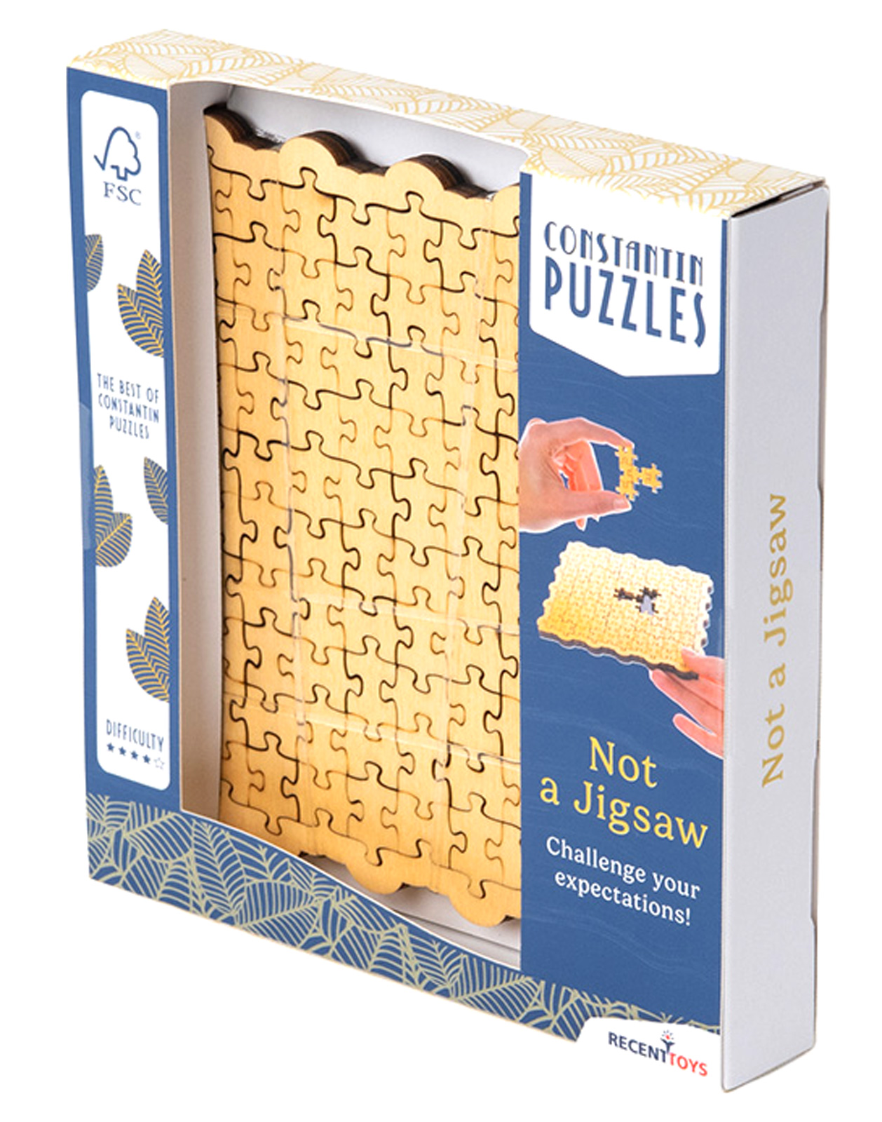 Rzuć wyzwanie swoim oczekiwaniom! W tej wyjątkowej układance, to co widzisz, nie zawsze jest tym co dostajesz. Wyjmij elementy z ramki i włóż je z powrotem. Czujesz różnicę...? Jaka sama nazwa wskazuje, to nie są standardowe puzzle. Jean Claude Constantin jest niewątpliwie jednym z najbardziej zapracowanych projektantów łamigłówek ostatnich trzydziestu lat. Wyjątkowe i różnorodne pomysły, które powstają w jego głowie, przemieniają się w unikalne i wizualnie zachwycające projekty. Łamigłówki Jean Claude'a uznawane są za bardzo wymagające. Aby je rozwiązać, będziesz potrzebował dużej aktywności szarych komórek, odpowiedniej koncentracji i odrobiny wyobraźni. Recent Toys to producent łamigłówek z Holandii. Jak sami o sobie mówią: "Tworzą zagadki dla wszystkich." Jeżeli lubisz matematykę, logikę, układanie wzorów lub po prostu jesteś cierpliwy i wytrwały, to na pewno znajdziesz coś dla siebie! Choć wszystkie łamigłówki są unikatowe to mają one następujące cechy wspólne: 1. Prostota - zagadki są łatwe do wytłumaczenia. Nasz umysł ma się skupić na rozwiązaniu łamigłówki, a nie na zrozumieniu zasad. 2. Mądrość - łamigłówki są zaprojektowane tak, aby zmusić nasz umysł do poszerzenia horyzontów i otwarcia na nowe pomysły. 3. Wytrzymałość - łamigłówki zbudowane są z odpowiednich materiałów. Elementy można przesuwać z wyjątkową łatwością. Chodzą płynnie, szybko i się nie zacinają. ZAWARTOŚĆ: łamigłówka Not a Jigsaw (wymiary: 14,5x14,5 cm) książeczka