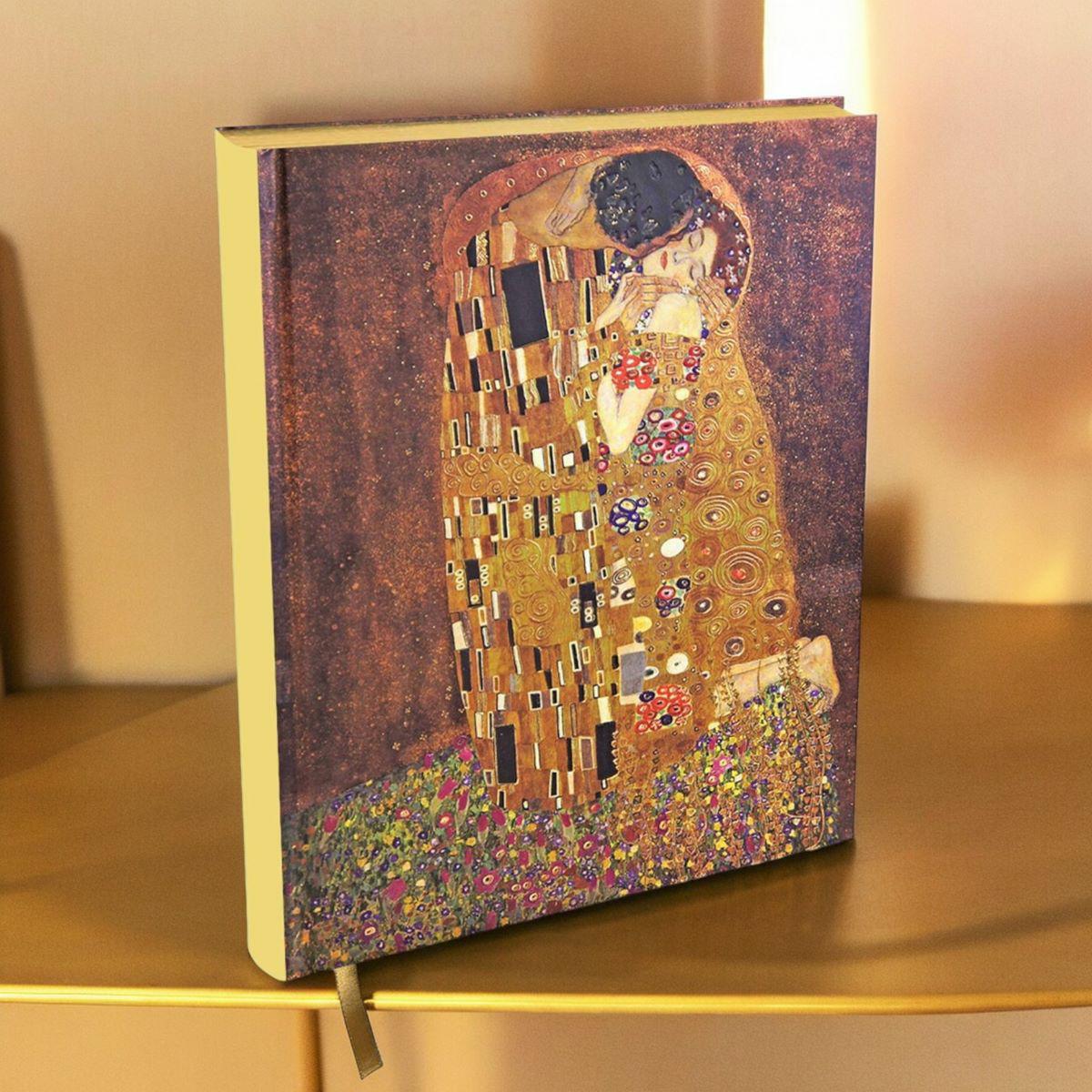 Notatnik Duży Pocałunek marki Peter Pauper Press. Posiada oryginalną okładkę z wytłaczanymi wzorami i tylną kopertą na drobne notatki oraz złocone brzegi kartek. Posiada wstążkę jako zakładkę. Notatnik zszywany. 192 stron w linię.