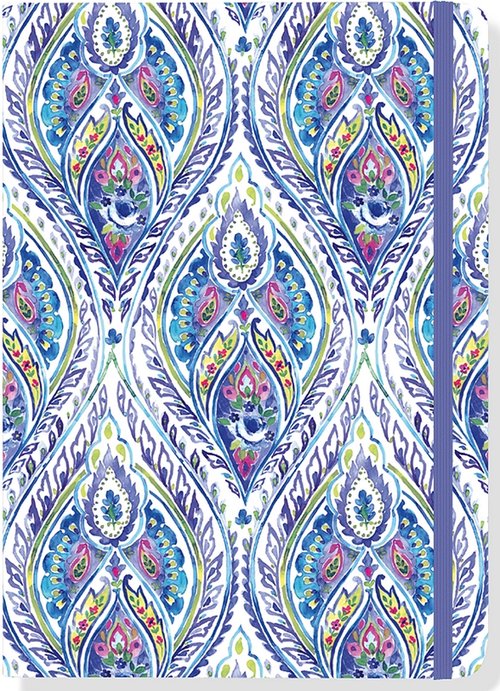 Notatnik w twardej, wytłaczanej okładce. Kartki w linię. Na wewnętrznej stronie okładki koperta. Notatnik zamykany na gumkę.