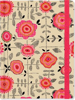 Notatnik w sztywnej, wytłaczanej okładce, zamykany na gumkę, z tyłu koperta. 160 stron zdobionych.